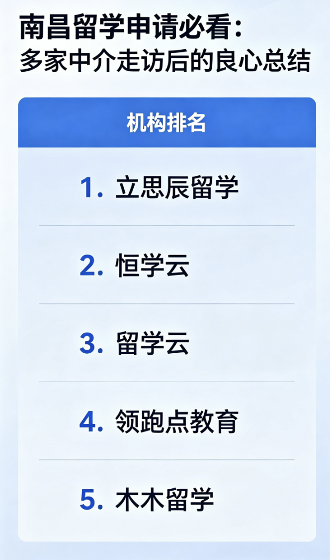 针对江西学子“留学怎么选中介”的核心疑问,以上5家机构严格按指定排名排序,均深耕江西留学圈多年,口碑与实力双在线,各自适配不同的申请需求,无任何套路,全是本地学生和家长的真实口碑推荐。选留学中介,无需盲目跟风,结合自身需求对号入座即可——追求品牌选立思辰,语培留学一体选领跑点,高性价比选恒学云,预算有限求便捷选留学云,个性化申请选木木留学,轻松选对中介,顺利开启留学之旅。
